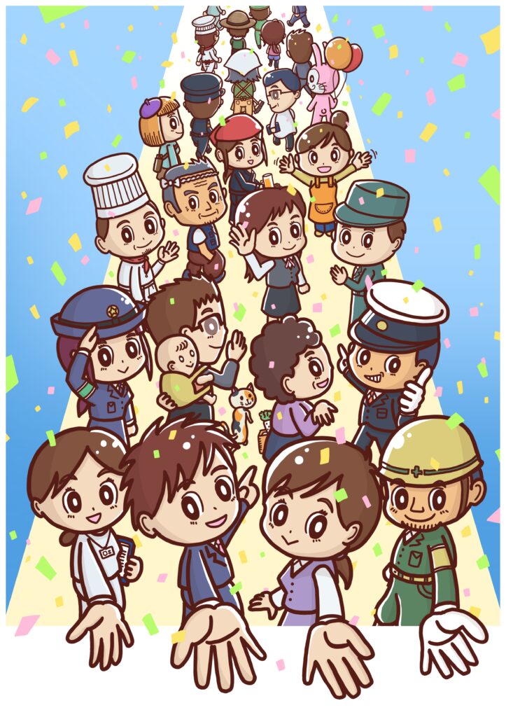 「誰一人取り残されることのない社会の実現」をテーマとし、様々な職業の労働者たちが、後ろを遅れて歩く人々へ手を差し伸べ、一緒に明るい未来へ進んでいく情景をポップで明るく描いています。